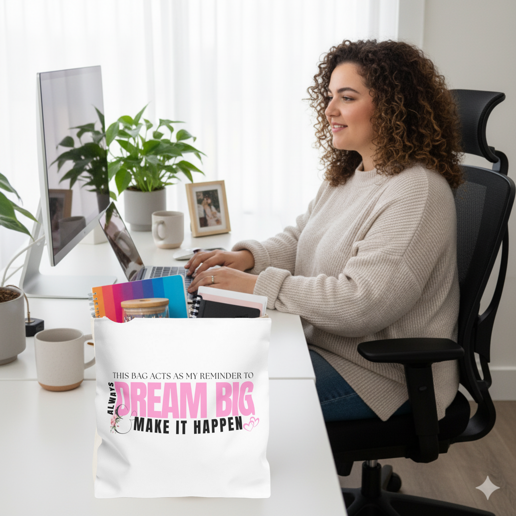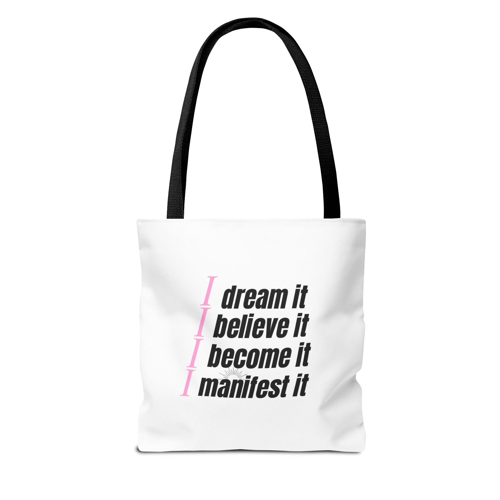 With its generous 18×18 inch dimensions, this tote is built to handle it all. It’s large enough to fit your Unstoppable Laptop Sleeve, Manifestation Journal, and your daily essentials with room to spare. The minimalist “Dream Big” typography is paired with our signature butterfly, symbolizing your continuous transformation.